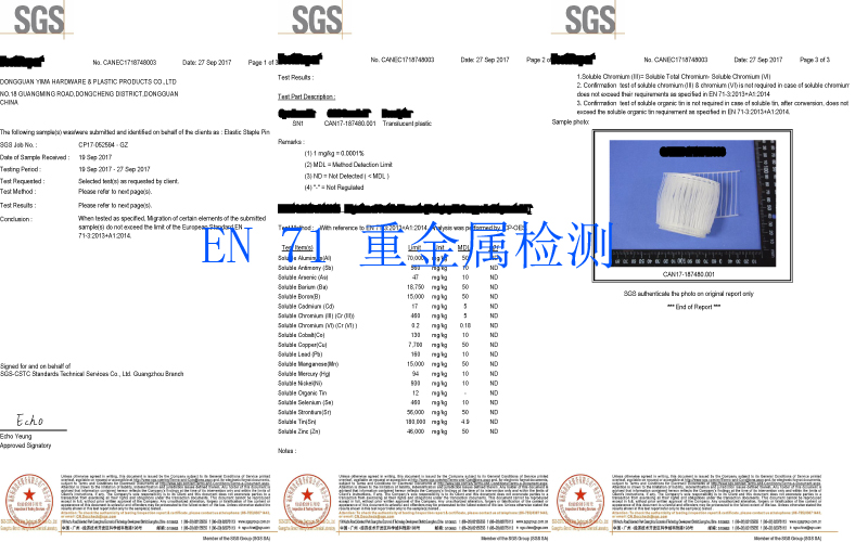 國際標準SGS實驗室也對YIMA膠針系列產品做了多項標準檢測:其中EN71-3是歐盟玩具有關有毒金屬含量的檢測;European council directive 是94/62/EC包材類指令檢測;